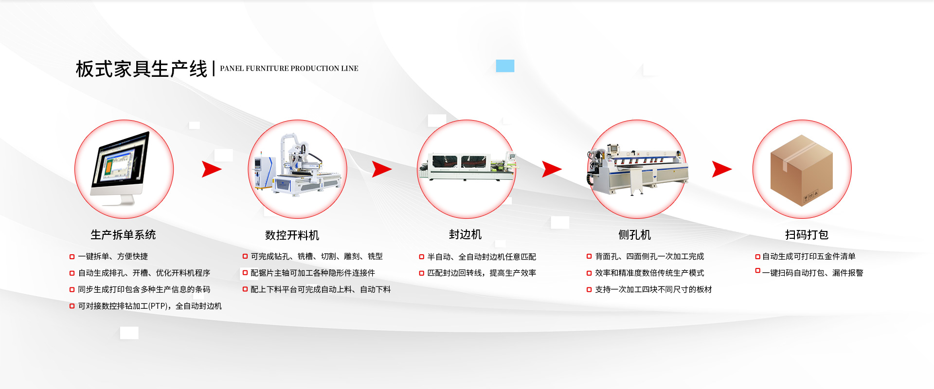 板式家具生產線是目前各大家具廠中常用的設備加工方式,它是由數控開料機、封邊機、數控鉆孔設備、拋光機、覆膜機、精密鋸、雙頭鉸鏈鉆組合而成一套完整的生產線... 閱讀詳情 >>