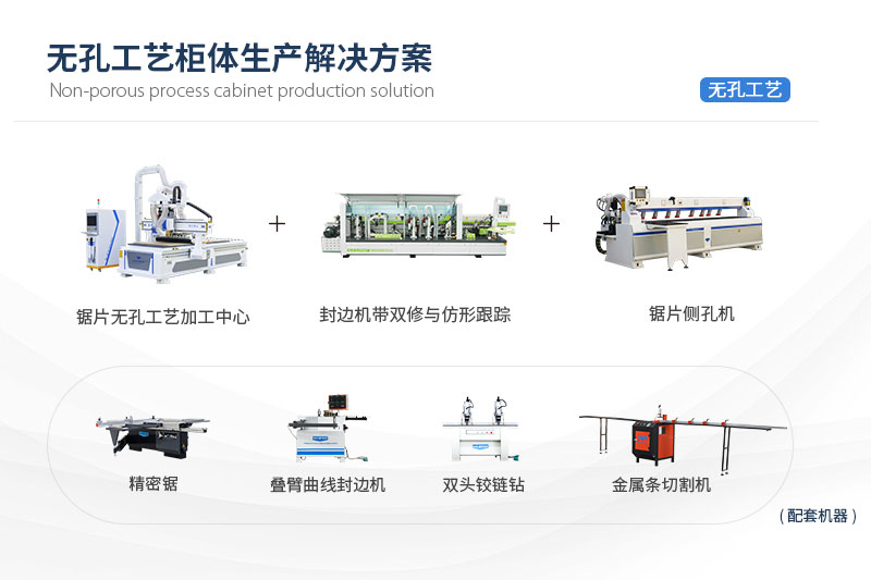 無孔工藝柜體生產解決方案,主要由無孔工藝加工中心、鋸片側孔機、全自動封邊機三種設備組成,可用于加工生產板式家具、櫥柜、衣柜、兒童家具等柜體的生產加工,滿足家具生產廠家對無孔家具(使用隱形連接件連接)、板式家具(使用二合一、三合一連接件)及普通板式家具的加工需求;
