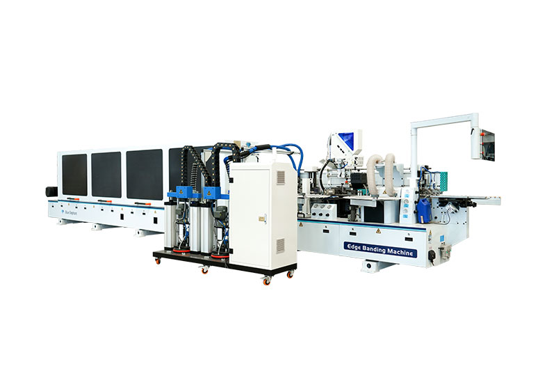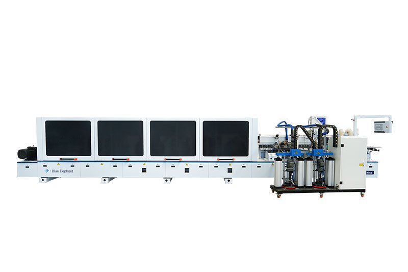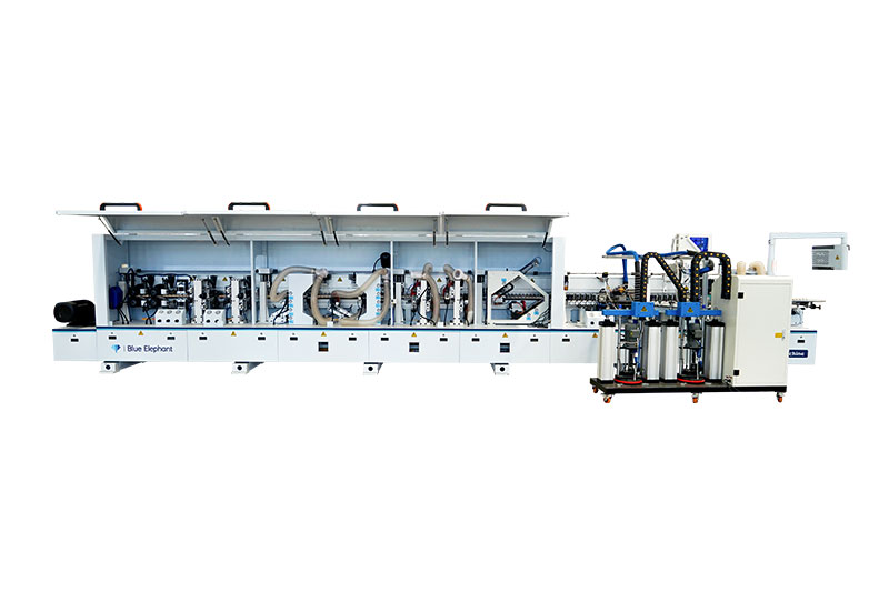 E-80全自動封邊機功能:前分離-預銑-上膠鍋+快速溶膠六輪壓貼1-下膠鍋+六輪壓貼2-快速齊頭-氣動精修1-氣動精修2-四頭跟蹤倒角-氣動刮邊1-氣動刮邊2-斷絲+平刮-后清洗-拋光1-拋光2