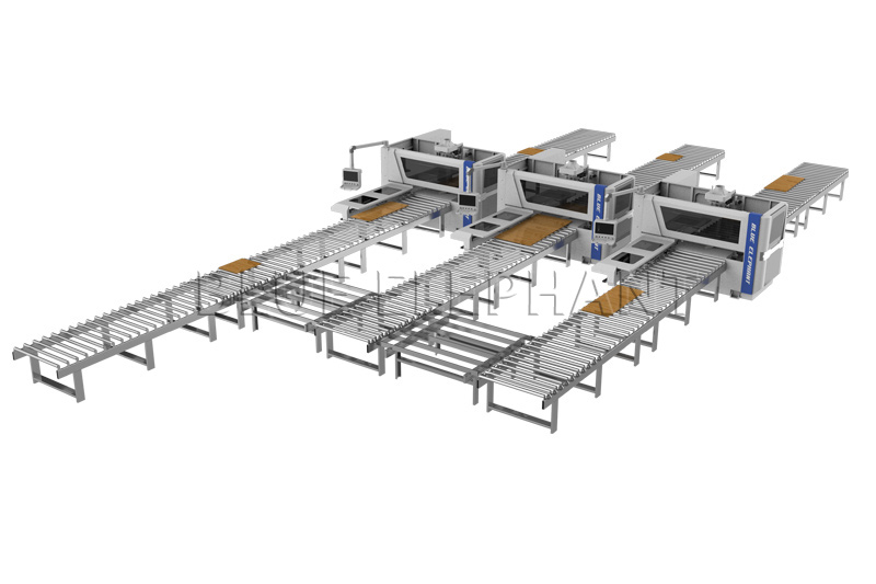 封邊完成的板材被送入至六面鉆---完成全部打孔后采用“前進前出”或“前進后出” 板料輸出方式---進入緩存倉,進行后續分揀打包