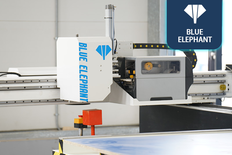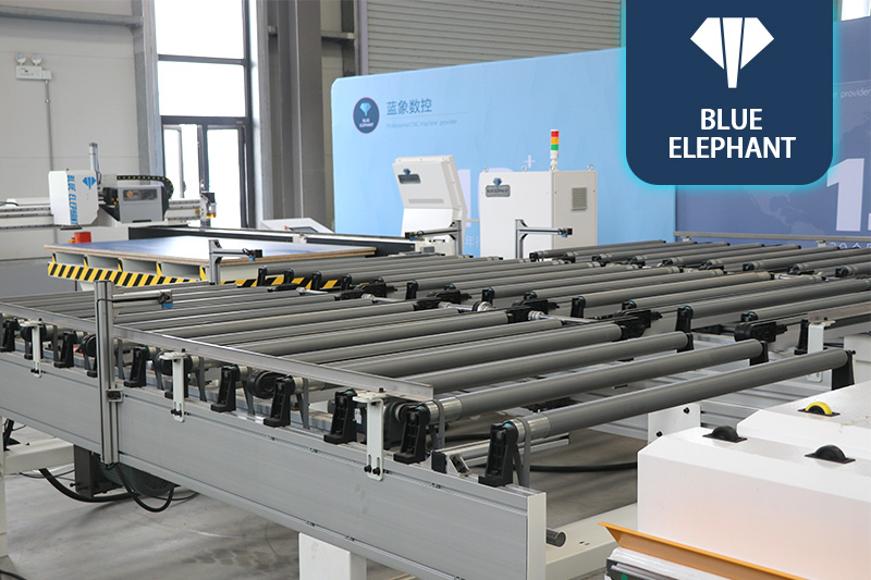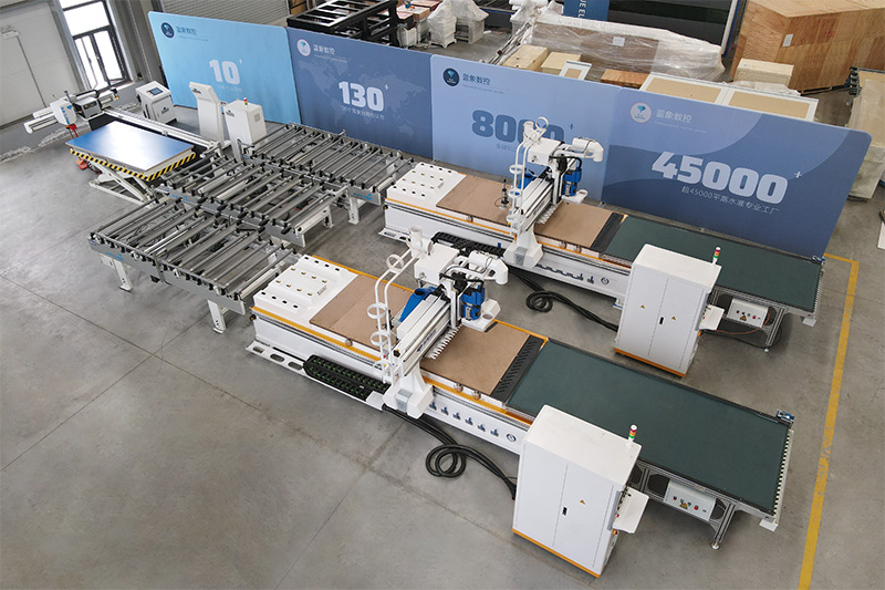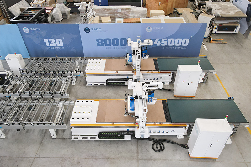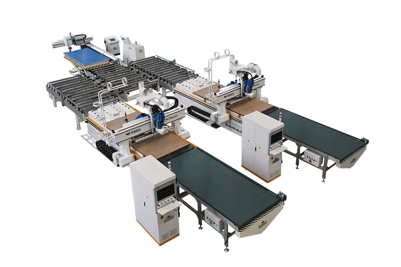 一拖二開料單元是一套自動化程度比較高的數控開料解決方案。開料單元由一臺高速自動貼標機、兩臺全自動數控開料中心以及動力滾筒線、中控系統組成。人工只需將板材放置在升降機上,由貼標機自動貼標,再由中控系統自動分配至開料中心,完成板材切割工作。如選配機器人系統,可由機器人完成碼垛,余料利用及廢料輸出等工作。